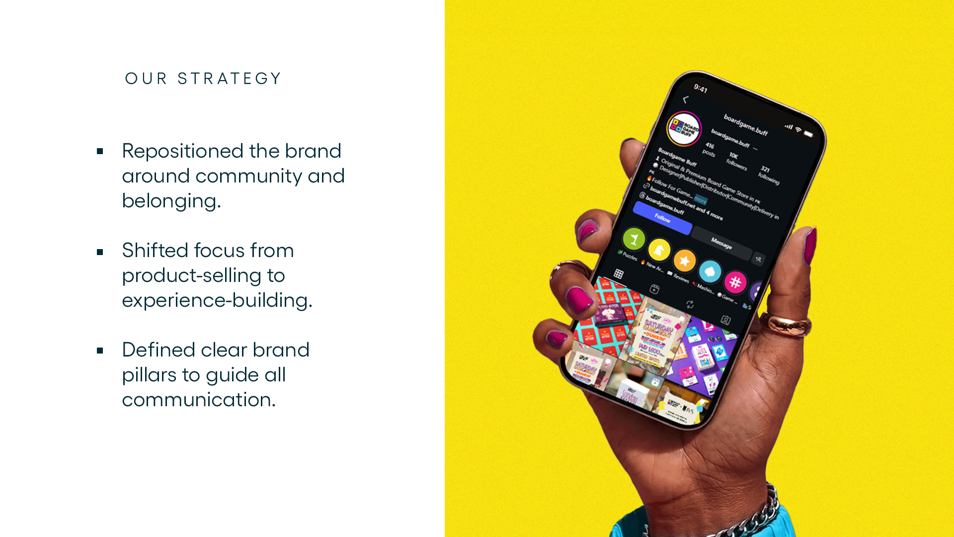 We introduced an experience-led content approach, focusing on game nights, social interaction, and community-driven storytelling.